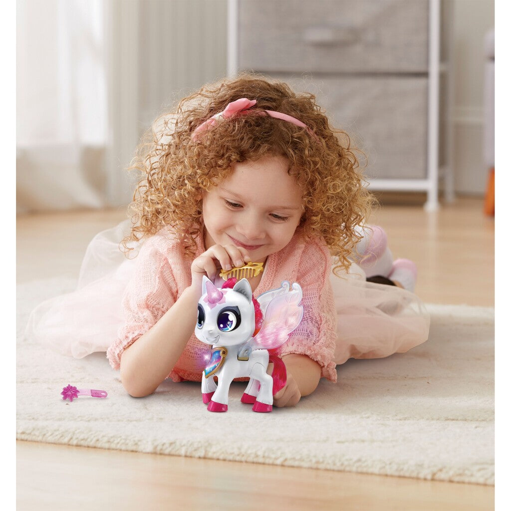 Tijd voor magie! Druk op de magische ketting om een kleur te kiezen en raak de hoorn, ogen en vleugels van Stella aan om deze van kleur te veranderen. Druk op haar poot om de vleugels te laten bewegen of op haar hoorn om kleuren en emoties te ontdekken! Druk op haar mond of bedek haar ogen voor nog meer leuke reacties. Inclusief kammetje en twee haarclipjes.