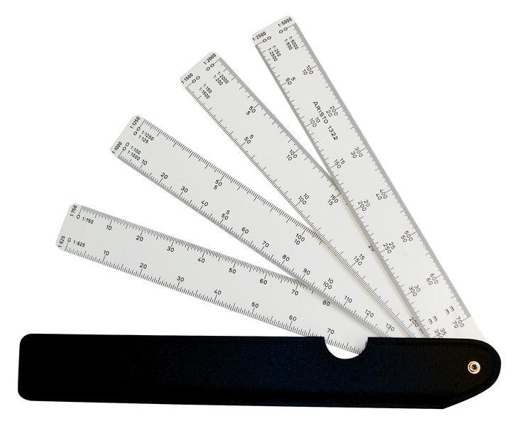 Waaierliniaal: een handige waaier in zakformaat met verschillende reductie schalen. In een exclusieve leren omhulsel. Nauwkeurige voorgedrukte schalen
