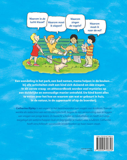 Waarom is de lucht blauw? Waarom moet ik slapen? Waarom zingen de vogels? Waarom moet ik naar de wc? Een wandeling in het park, een bad nemen, mama helpen in de keuken… bij alle activiteiten stelt een kind zich duizend-en-één vragen. In dit eerste vraag- en antwoordboek worden veel mysteries op een duidelijke en eenvoudige manier ontrafeld. Uw kind komt alles te weten over het hoe en waarom van wat er gebeurt in huis, in de natuur, in de supermarkt of op de boerderij. Catherine Ripley is een expert in het beantwoorden van vragen van kinderen. Toen ze werkte als redactrice van een kindertijdschrift, begon ze een verzameling aan te leggen van vragen van jonge lezers. Ze bezocht scholen en bibliotheken en heeft zich erop toegelegd om wetenschappen leuk en begrijpelijk te maken voor kinderen. Catherine heeft verschillende succesvolle kinderboeken op haar naam staan.