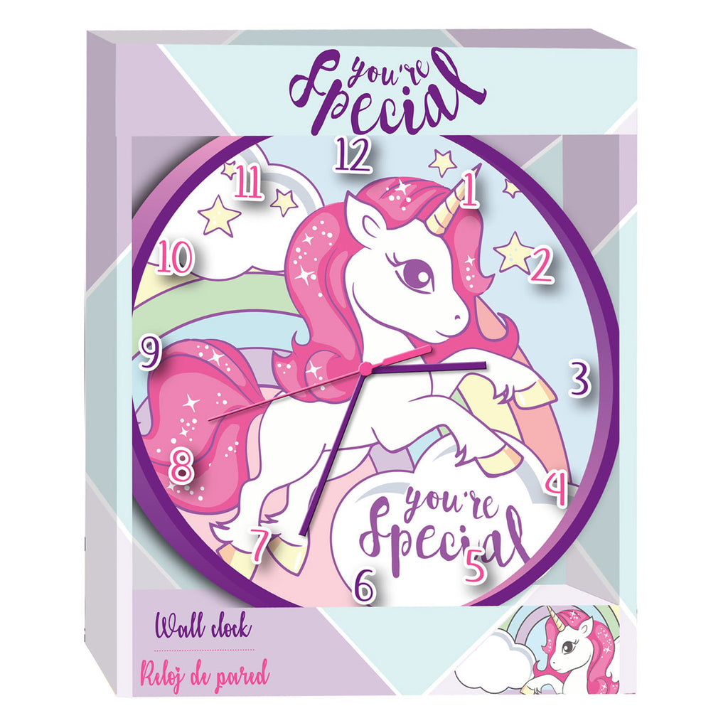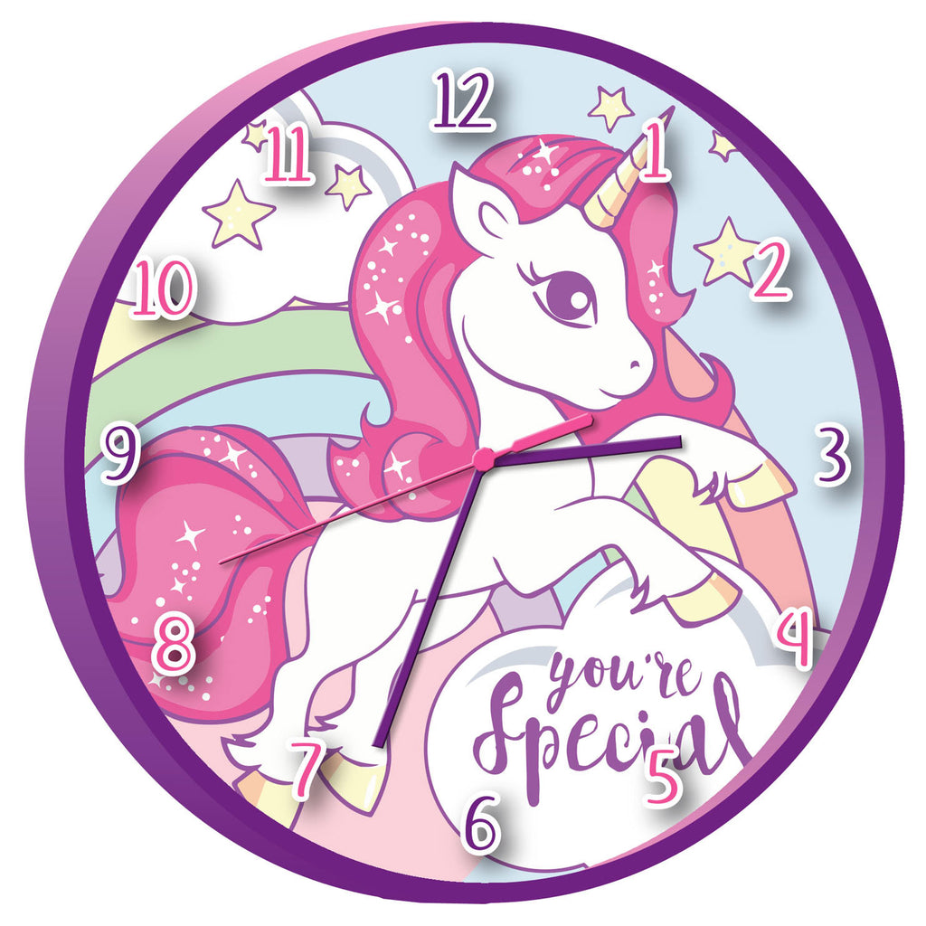 Wandklok Eenhoorn. De wandklok heeft een doorsnede van 25 centimeter. Werkt op 1 AA-batterij (niet inbegrepen).