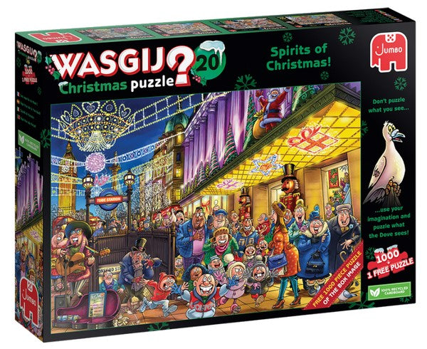 Wasgij Christmas 20 - De Geesten van Kerstmis! is een set van twee puzzels van elk 1000 stukjes met een uniek 'Wat zien zij?' concept. Gemaakt van gerecycled karton en geschikt voor puzzelaars vanaf 12 jaar. Afmetingen per puzzel: ca. 68 x 49 cm.