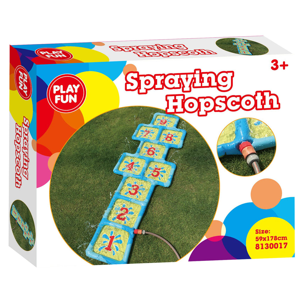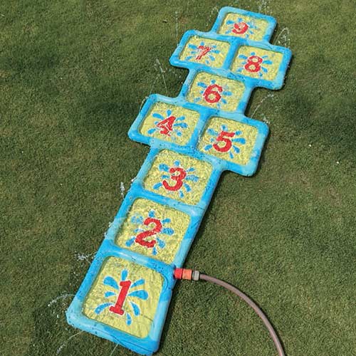 1.. spring 2.. spring 3.. spring en PLONS! Hinkel over deze mat en koel zo lekker af. Hinkelen is altijd al leuk geweest maar met deze hinkelbaan wordt het veel leuker en moeilijker. Sluit de mat aan op de tuinslang voor echte waterpret! De mat vult zich namelijk met water, en er spuiten allemaal straaltjes water om hoog. Kun jij over de hinkelbaan komen zonder nat te worden? Probeer de kleine sproeiers maar eens te ontwijken! Met deze hinkel mat kun je lang spelen in de zon zonder het te warm te krijgen. Geschikt voor kinderen van 3 jaar en ouder.