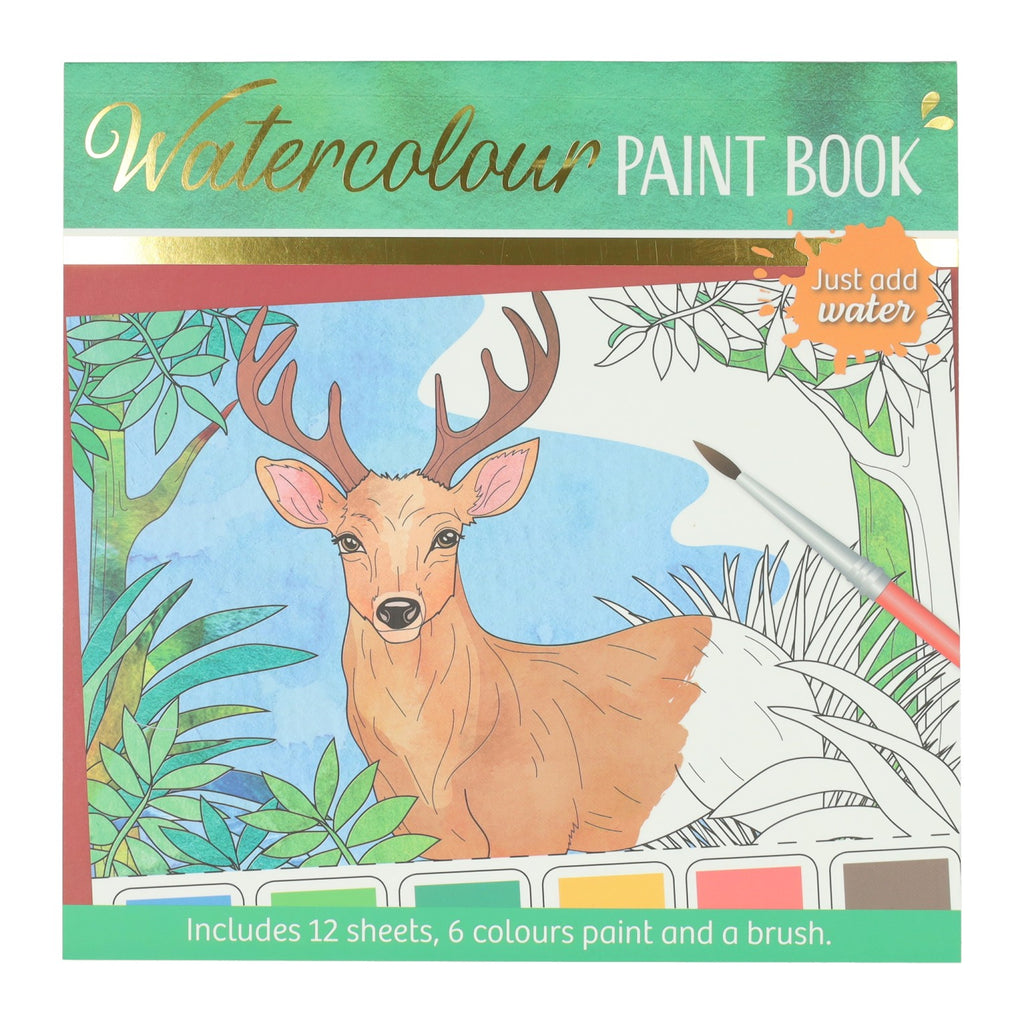 Waterverfkleurboek voor volwassenen met kleurplaten van bosdieren. Inclusief 6 kleuren waterverf per kleurplaat en 1 penseel.