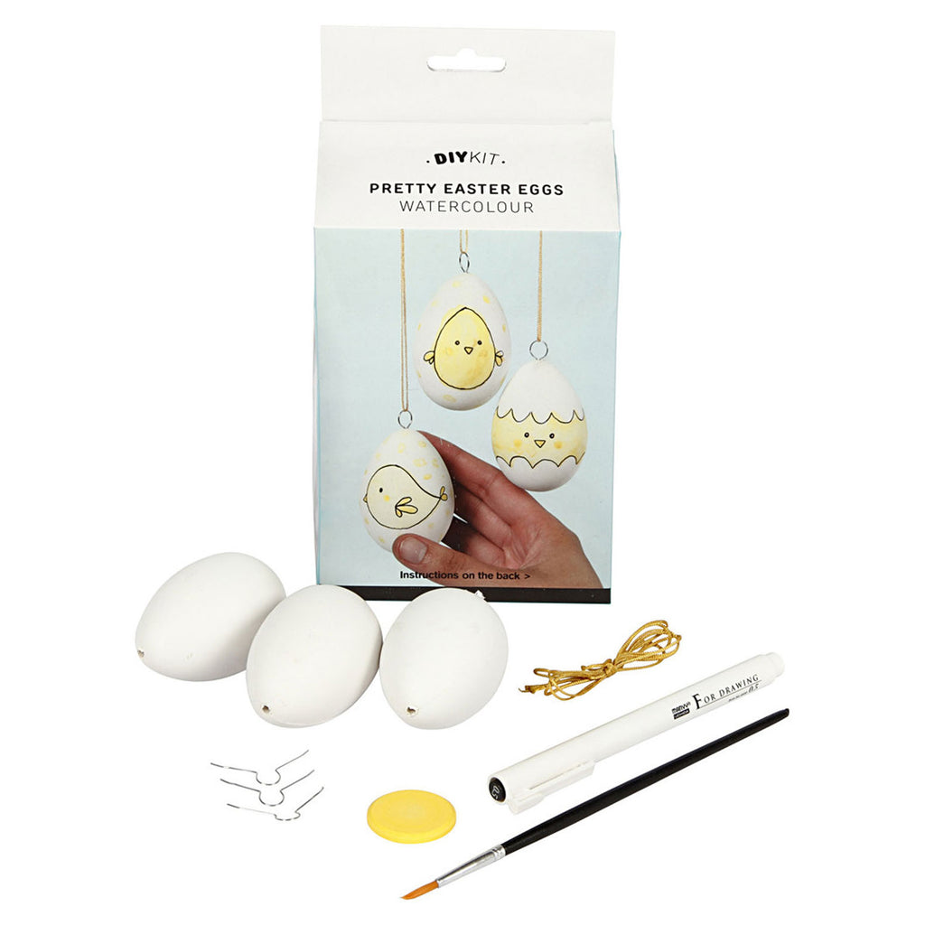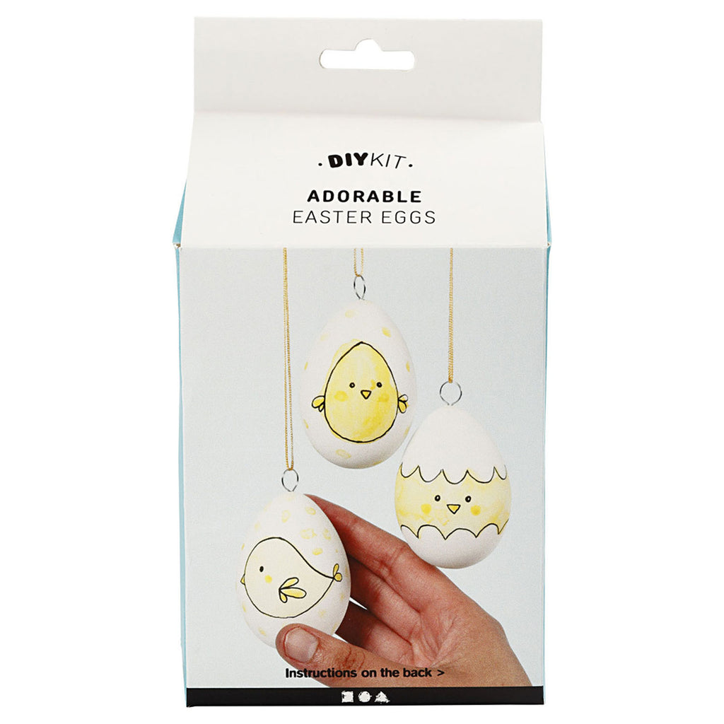 Materialenset voor 3 kuikentjes-hangers, gemaakt van plastic eieren gedecoreerd met waterverf en stiften. Inclusief ophangkoord.