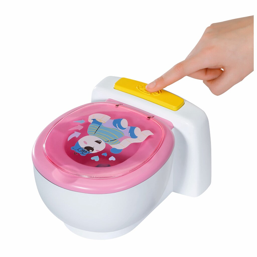 Baby Born potjemet geluidseffecten en magisch drolletje. Baby born is al een grote meid. Ze gaat vol zelfvertrouwen naar de wc. Als ze op haar witte troon zit met de roze wc-bril klinken er plasgeluiden, applaus en de blije lach van BabyBorn. De kleine meid kan zelfs een grote boodschap doen. Er valt dan een kleurrijk glitterdrolletje in de wc-pot. Snel, spoel het door. Als je op de knop van de spoelbak drukt, verdwijnt het drolletje en hoor je doorspoelgeluiden. Exclusief 2x AA-batterijen. Geschikt voor kinderen vanaf 3 jaar.
