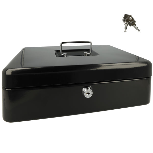 Met deze geldkist bergt u uw geld of waardevolle spullen veilig op. Deze geldkist gemaakt van staal wordt geleverd met 2 sleutels en heeft een kunststof inzet met 5 vakken voor munten. Doordat de geldkist een hangreep heeft die in de deksel valt kunt u de kist makkelijk opbergen. Afmeting: 301x242x91mm. Kleur: zwart.