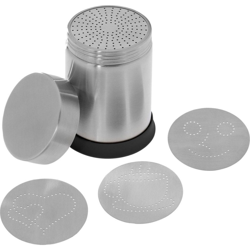 Deze praktische decoratie- en cacaostrooier van is ideaal voor het decoreren van koffie en warme chocolademelk; ook geschikt voor het versieren van gebak, desserts of borden met poedersuiker of cacaopoeder. Draai aan de zwarte ring en houd de strooier ondersteboven om drankjes of gerechten prachtig te versieren met stippen, een smiley, koffiekopje of hartje.Eenvoudig te vullen met cacaopoeder of poedersuiker en eenvoudig wisselen van de sjablonen dankzij het gemakkelijk te openen draaideksel; ruimtebesparende opslag van de sjablonen in het deksel.