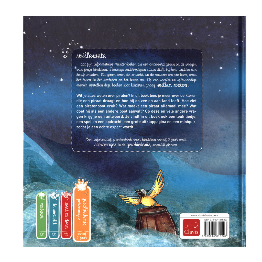 Wil je alles weten over piraten? In dit boek lees je meer over de kleren die een piraat draagt, hoe hij op zee en aan wal leeft. Hoe ziet een echte piratenboot eruit? Wat maakt een piraat allemaal mee? Wat doet hij als een andere piratenboot aanvalt? Op deze en vele andere vragen krijg je een antwoord. Je vindt in dit boek ook een leuk liedje en opdrachten, een grote uitklappagina en een miniquiz, zodat je een echte expert wordt.