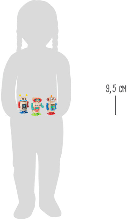 Set van 12. Deze robots gemaakt van FSC® 100%-gecertificeerd hout gaan hun eigen weg nadat ze zijn opgewonden. De armen kunnen bewegen en zijn met elastiekjes aan het houten lichaam bevestigd. Elk van de drie houten figuurtjes is bedrukt met hun eigen individuele patroon. Geen twee zijn gelijk. Geen kind kan deze schattige robots weerstaan! Koop uw eigen aantrekkelijke verkoopdisplay voor uw winkel.