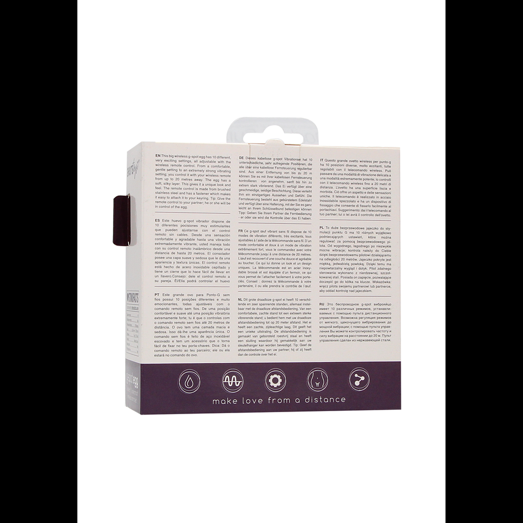 Dit grote draadloze g-spot ei heeft 10 verschillende en zeer spannende standen, allemaal instelbaar met de draadloze afstandsbediening. Van een comfortabele, zachte stand tot een extreem sterke vibrerende stand; u bedient hem met uw draadloze afstandsbediening tot op 20 meter afstand. Het ei heeft een zachte, zijdeachtige laag. Dit geeft het een unieke uitstraling. De afstandsbediening is gemaakt van geborsteld roestvrij staal en heeft een sluiting waardoor hij gemakkelijk aan uw sleutelhanger kan worden bevestigd. Tip: Geef de afstandsbediening aan uw partner; hij of zij heeft dan de controle over het ei.