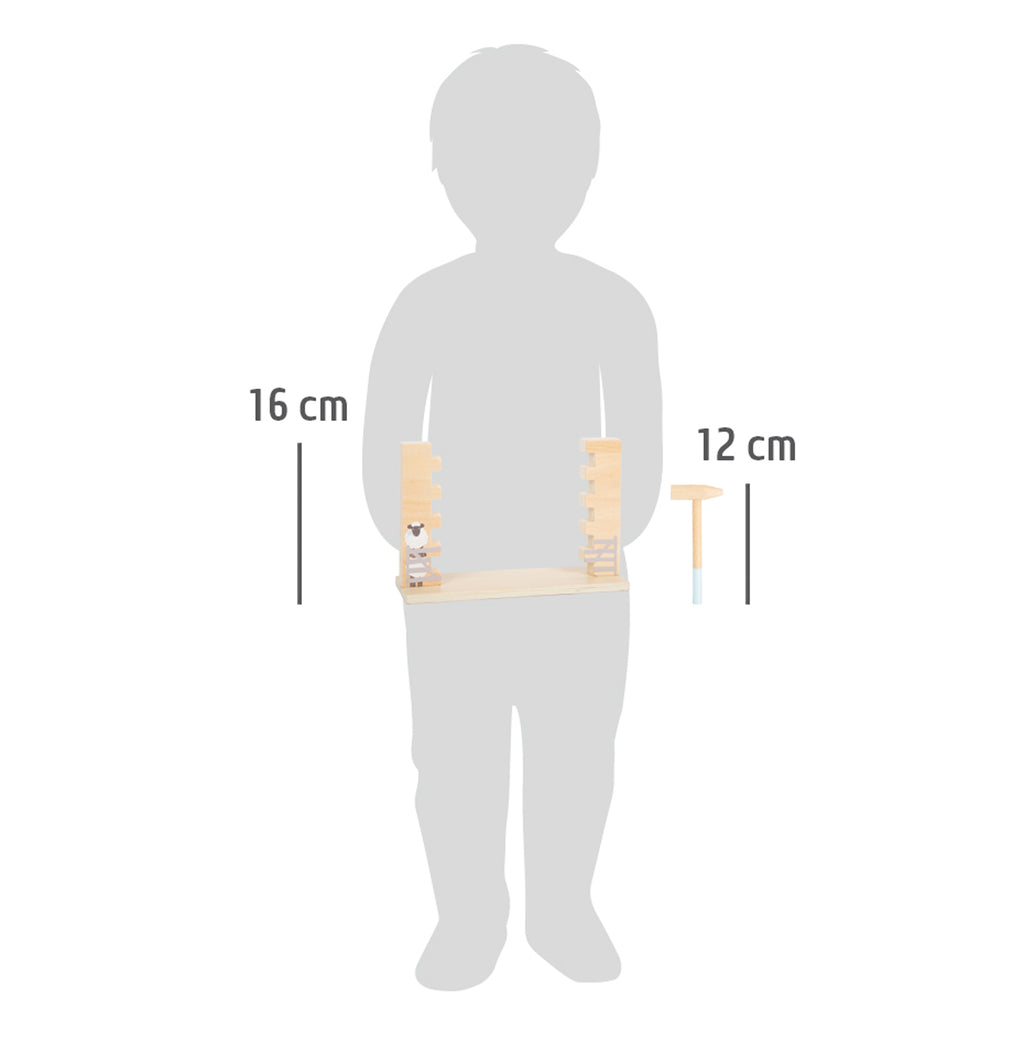 Wiebelplezier bij het weilandhek! "Schippy" het schaap en haar vrienden willen het land aan de andere kant van het hek op sluipen, dus het doel van dit spel is om met behulp van de twee handige houten hamers een gat in het "hek" te slaan. Het vereist concentratie en vaardigheid om dit te doen en tegelijkertijd te voorkomen dat de wiebelige muur instort. Maar pas op: als de muur instort, wordt de waakhond bovenop de muur wakker en is het spel afgelopen! Wordt geleverd met hoogwaardige speldoos voor opslag.