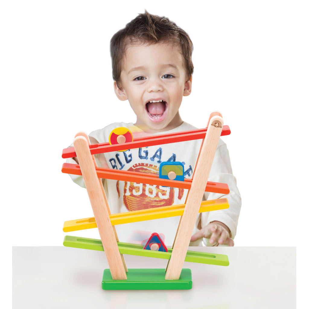 Rol het avontuur tegemoet met deze regenboog autobaan van Wonderworld. Plaats de rollende figuren bovenin de baan en zie hoe ze via de gekleurde banen naar beneden racen. De autobaan is gemaakt van stevig hout en afgewerkt met vrolijk gekleurde details. Inclusief 3 rollende figuren. Spelen met de set geeft inzicht in oorzaak en gevolg en stimuleert de ontwikkeling van concentratie.