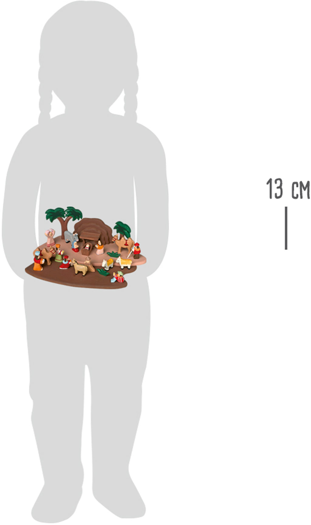 Houten kerststal - Dit met de hand uitgesneden houtwerk is niet alleen een mooie adventsdecoratie, het is ook een geweldig speelkribbetje! Maria en Jozef, het kindje Jezus, de drie koningen, de engel en de herders met hun dieren - ze zijn hier allemaal bijeen. 23 kleurrijke houten onderdelen, grote handgesneden versie.