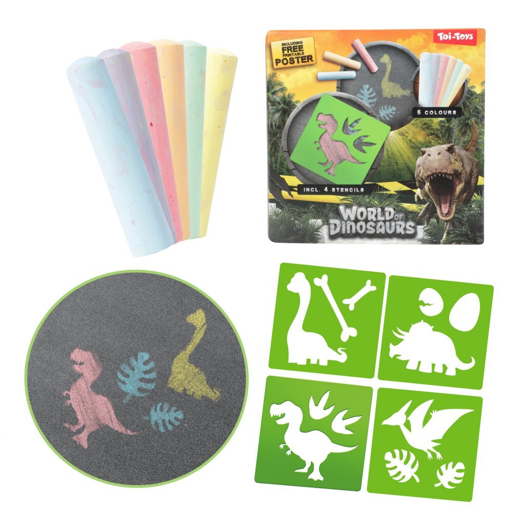 Stoepkrijtset van World of Dinosaurs met 6 stuks stoepkrijt en 4 stencils. Inclusief gratis printbare poster. Geschikt vanaf 3 jaar.
