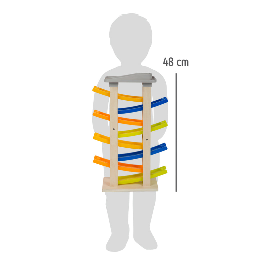 Op "go", we gaan! De vier raceauto's scheuren over de extra hoge click-clack racebaan van natuurlijk hout met stabiele kunststof oprijplaten. De acht schansen en een uitgang zorgen voor extra lang rijplezier. Het parkeerdek met vier parkeerplekken bevindt zich bovenaan dit hoge speelgoed en biedt voldoende parkeerplekken voor de kleurrijke houten speelgoedauto's voor en na de brede ritten. Wordt geleverd met een stabiele basis voor stabiliteit! Enorm speelplezier voor alle jonge racebaanfans! Bevordert de ontwikkeling van motorische vaardigheden en hand-oog coördinatie. De klikkende en klepperende geluiden van de auto's die over de schans naar beneden rollen zorgen voor akoestische hoogtepunten. Ben je klaar om te beginnen?