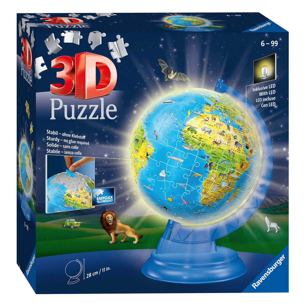Van Afrika naar Málaga? Van Groenland naar de Galapagoseilanden? Met deze 3D puzzel wordt topografie echt leuk. Stukje voor stukje ontdekken kinderen de wereld - en dankzij de nieuwe lichtfunctie kunnen wereldreizigers nu ook in het donker op safari gaan. Aan de hand van geïllustreerde foto's kunnen puzzelliefhebbers leren welke dieren in welke landen voorkomen en hoe de grote oceanen heten. Bevat: 180 genummerde kunststof-puzzelstukjes, standaard, draaibare voet, led verlichting