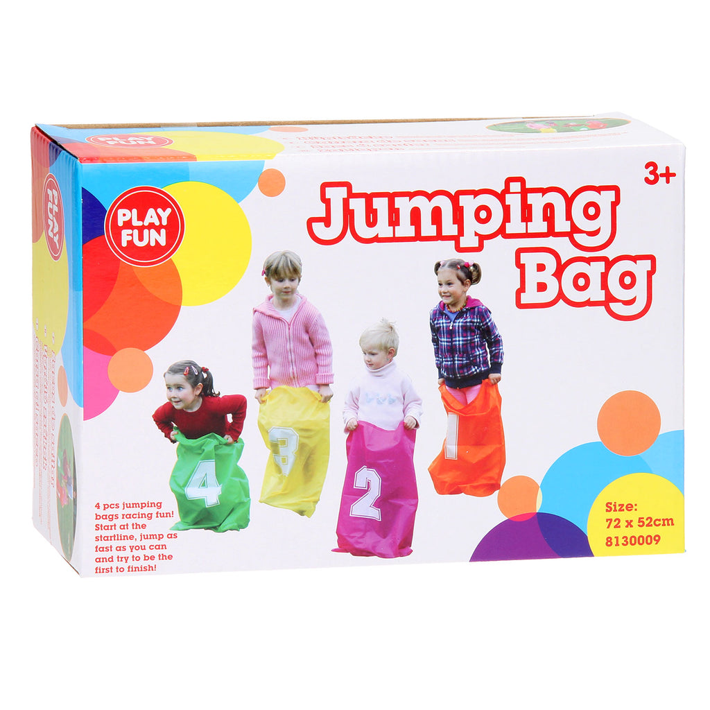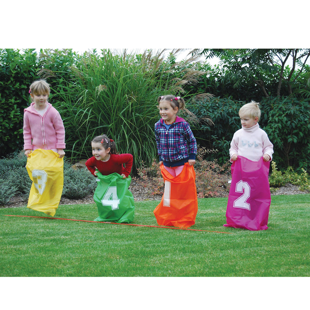 Win een wedstrijd zaklopen met deze leuke set. De set bestaat uit vier zakken en 4 kunststof haringen om het bijgeleverde start- en finish-lint op de grond te kunnen spannen. Elke zak heeft een eigen kleur en nummer. Zorg dat jij het snelst aan de overkant bent en win!