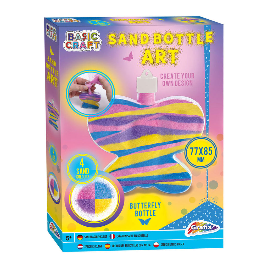 Zandkunst Vlinder. De vlinder waar de zandkunst in komt is 8,5 bij 7,7 centimeter. In de verpakking zitten vier zakjes met gekleurd zand.