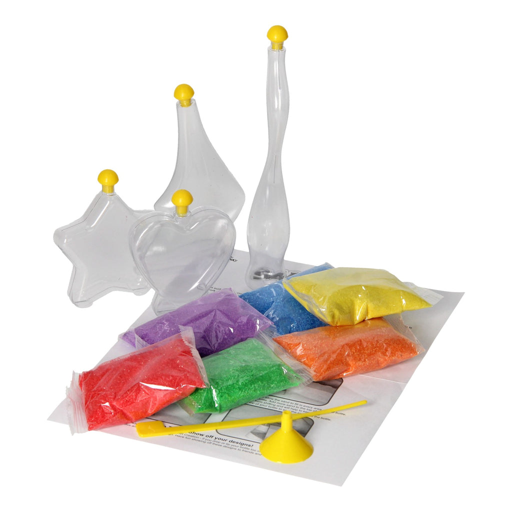 Kleine kunstenaars kunnen naar hartenlust knutselen met dit zandkunst pakket. In de kunststof flesjes kunnen prachtige ontwerpen gemaakt worden met het felgekleurde zand. De set bevat vier kunststof flesjes, zes kleuren zand, een trechter en een ontwerptool. Inclusief instructies. Geschikt vanaf 5 jaar.