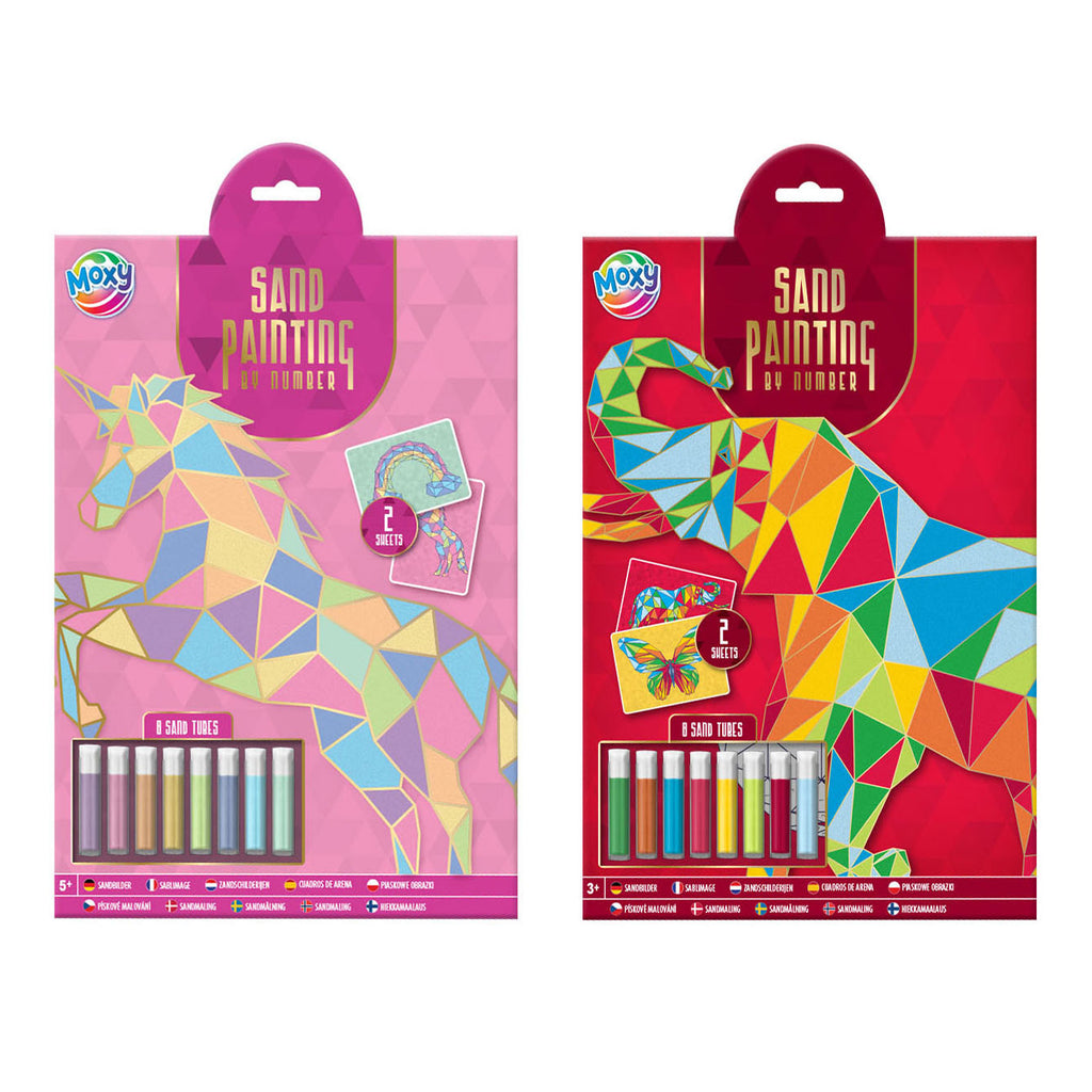 Knutselset voor schilderen op nummer met zand, inclusief 2 A4-vellen en 8 buisjes gekleurd zand. Verkrijgbaar in variant Unicorn en Dieren. Geschikt voor kinderen vanaf 5 jaar.