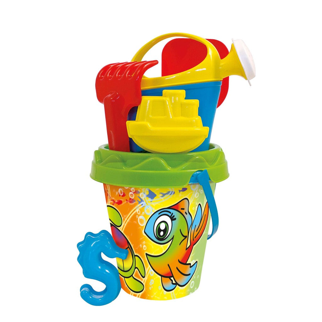 Deze emmerset met zeedieren-print is erg leuk voor kinderen om mee te spelen in het zand of water. Het setje bestaat uit een emmer, gieter, harkje, schepje en 2 vormpjes. Geschikt voor kinderen vanaf 12 maanden.