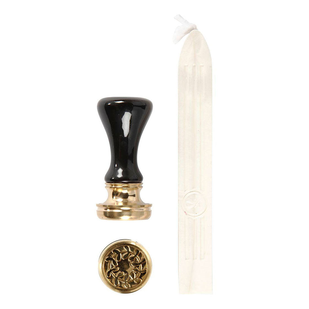 Starterset met rode zegelwas met een lont, handvat en zegel met motief van een lauwerkrans. De zegelwas wordt gesmolten en gedruppeld op de plek die u wilt decoreren. Druk daarna het motief in de warme was. Genoeg voor ca. 10 zegels