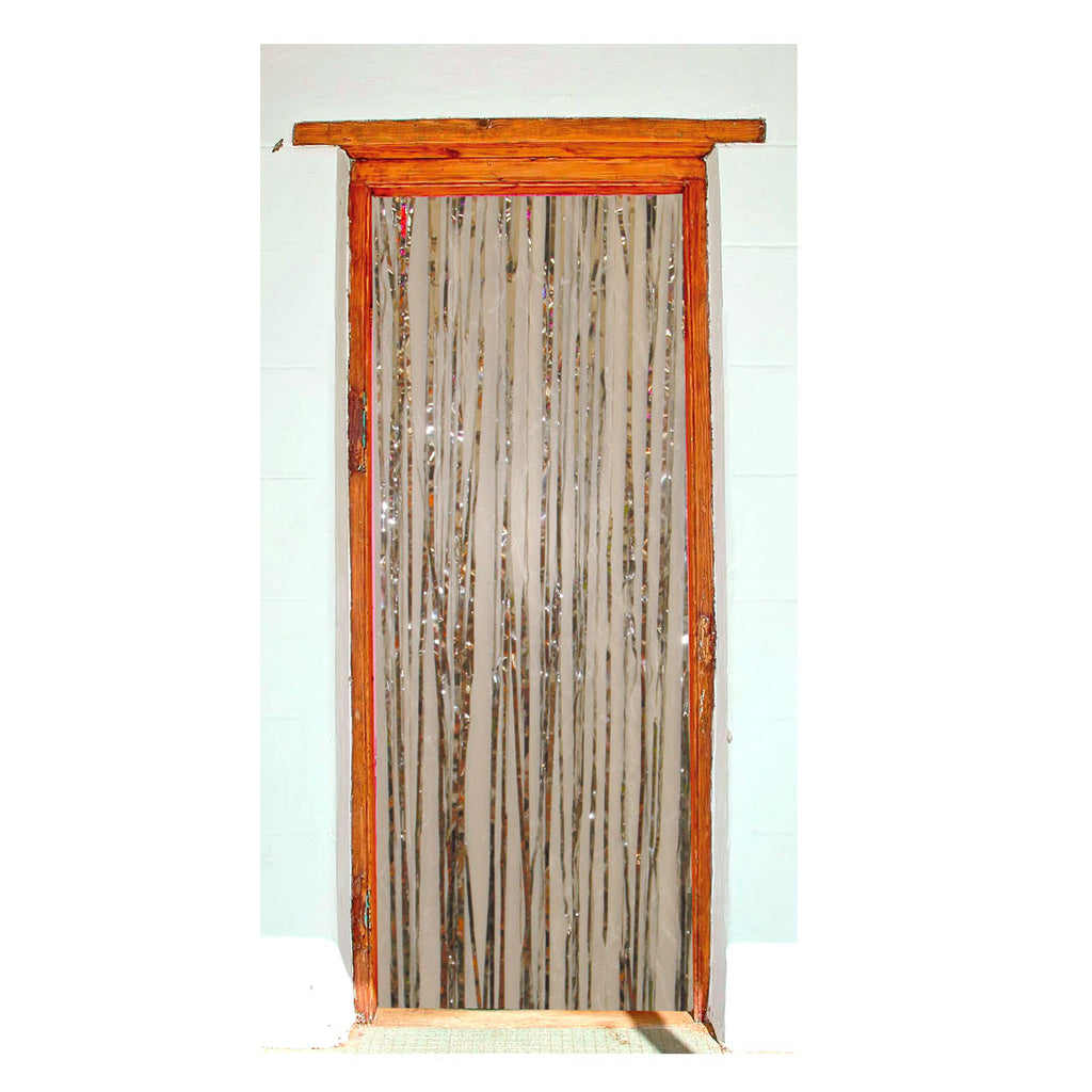 Zilveren deurgordijn van folie.