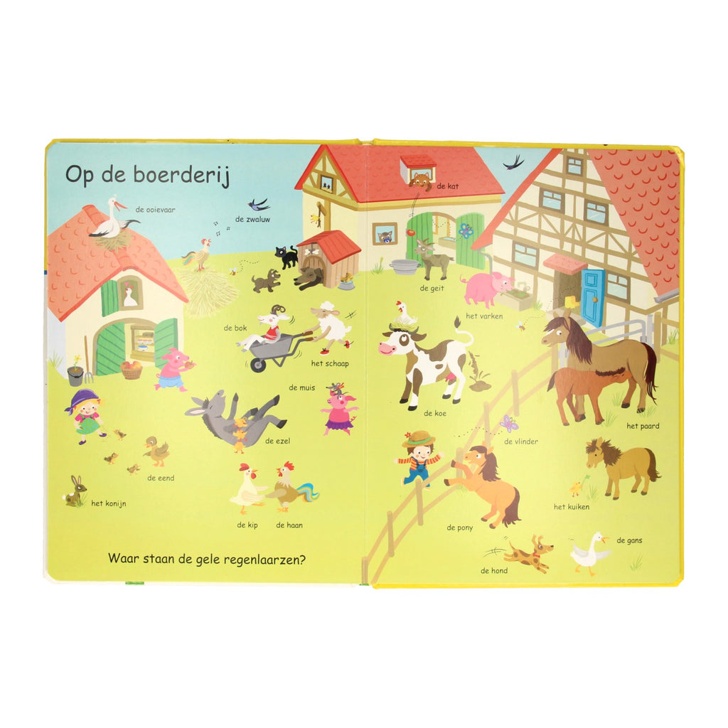 Op zeven grote afbeeldingen worden diverse dieren voorgesteld en benoemd. Een kakelbont beeldwoordenboek voor jonge dierenvrienden!