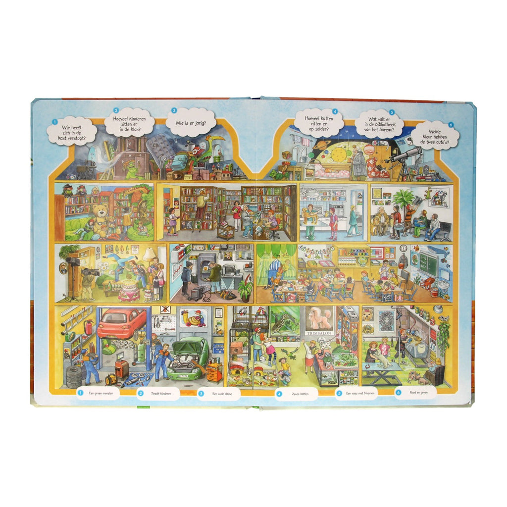 Neem een kijkje inhet overvolle huis en voer de spannende zoekopdrachten uit! Een leuk zoekboek voor kinderen vanaf 3 jaar oud.