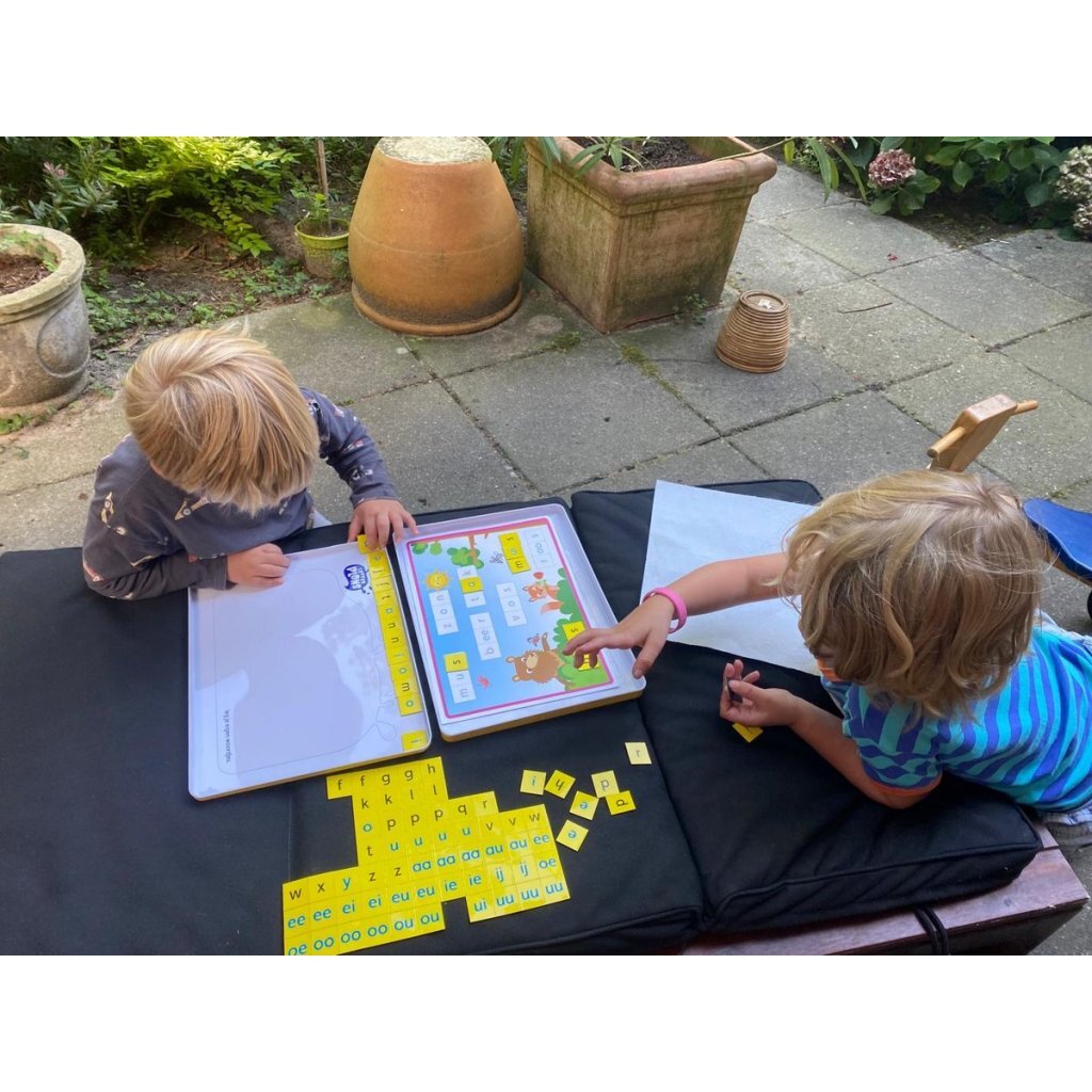 Op de kleurrijke werkbladen staan allerlei leuke letter- en woordspelletjes. Kinderen kiezen een blad uit en leggen het in de deksel van de doos. Vervolgens plakken ze de magneten erop. Zo oefenen ze spelenderwijs met álle letters van het alfabet. De letterdoos is geschikt voor school, thuis én onderweg.